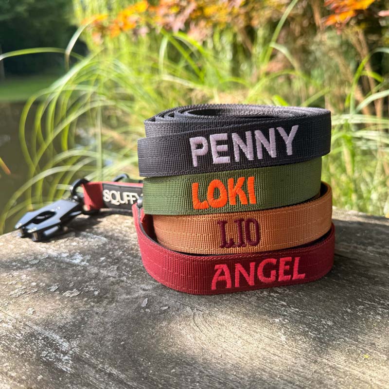 Each collar is stitched by us on sturdy, flexible nylon, so a tiny wiggle or slightly off-straight letters can happen.