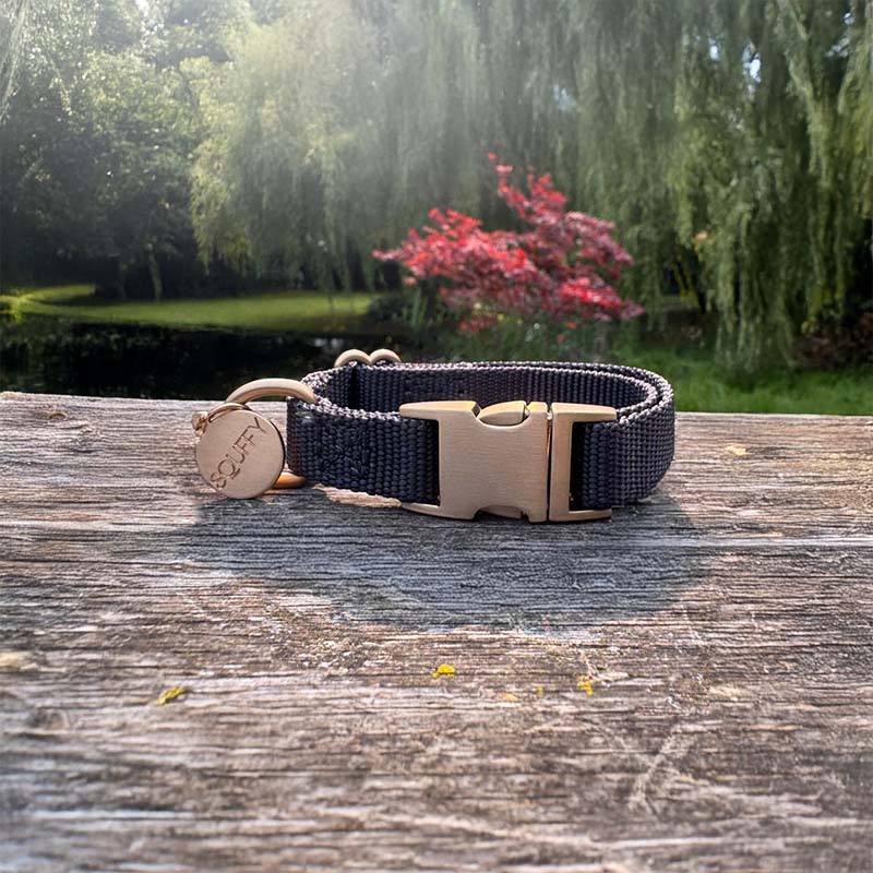 It allows for sleek, polished finishes (like gold tones!) while remaining rust-resistant and comfortable for your dog to wear. It’s also lighter than steel or brass, making it ideal for daily use.